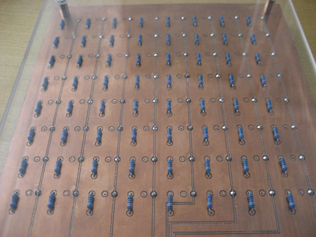 Die Herstellung erfolgt mit einer beidseitig beschichteten Platine. Auf jeder Seite können so die Bahnen für die Douts 1-8 oder die Douts 9-16 gefräst werden. Vom Anschluss mit einem SubD25 muss lediglich ein „Durchbruch“ zur anderen Seite für jeweils 8 Douts erstellt werden.